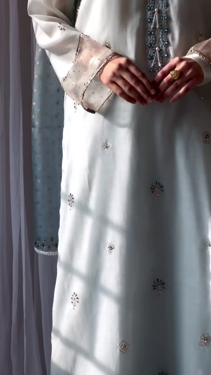 Discover the elegance of Eid with our “Bahaar Eid aur Tum” collection. This 3-piece handspun silk lawn suit, in pastel blue, is adorned with graceful block prints and fine resham embellishments, offering a blend of tradition and sophistication for your festive wardrobe. Limited pieces available.